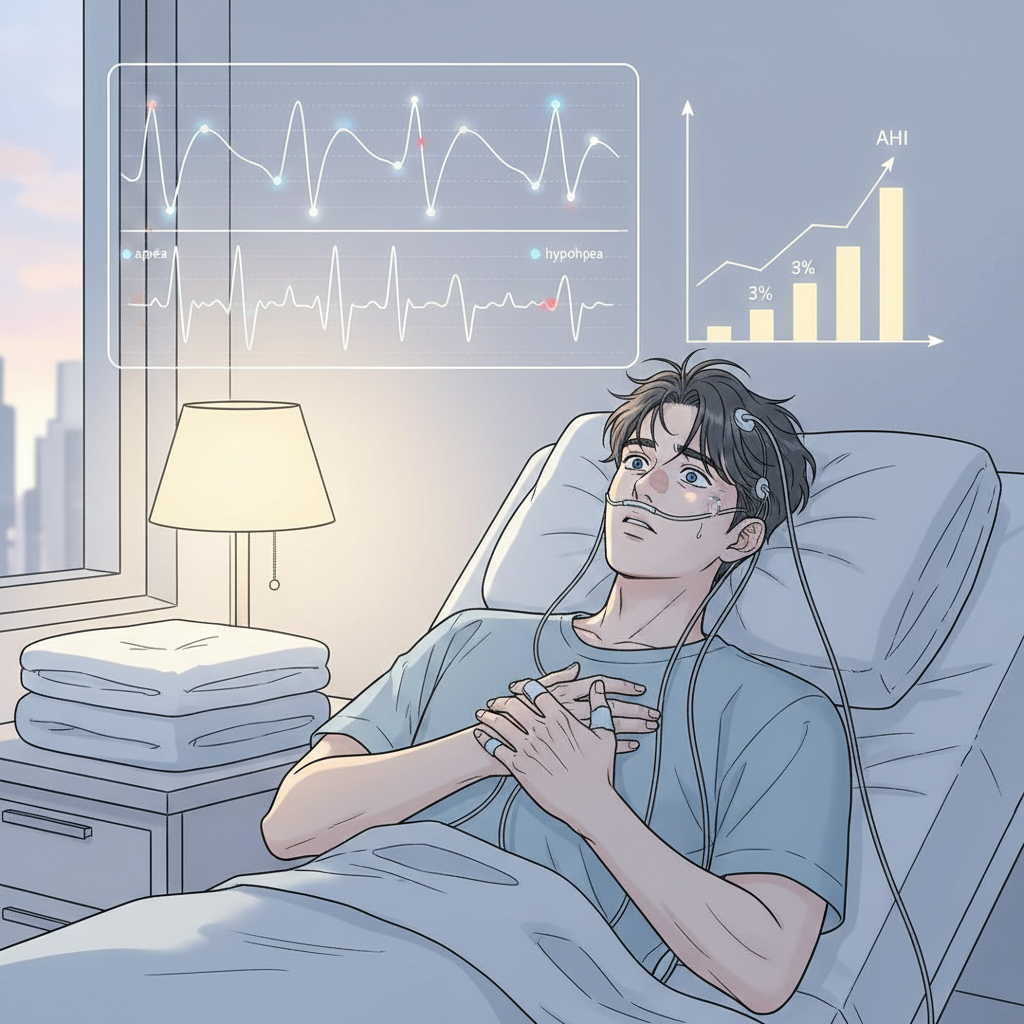 수면다원검사는 하룻밤 동안 환자의 뇌파, 안구 움직임, 근육 활동, 심전도, 호흡 노력, 산소포화도, 코골이 등을 종합적으로 측정하여 수면 중 발생하는 이상 현상을 분석하는 검사입니다. 이 검사를 통해 '무호흡-저호흡 지수(Apnea-Hypopnea Index, AHI)'를 산출하게 됩니다.