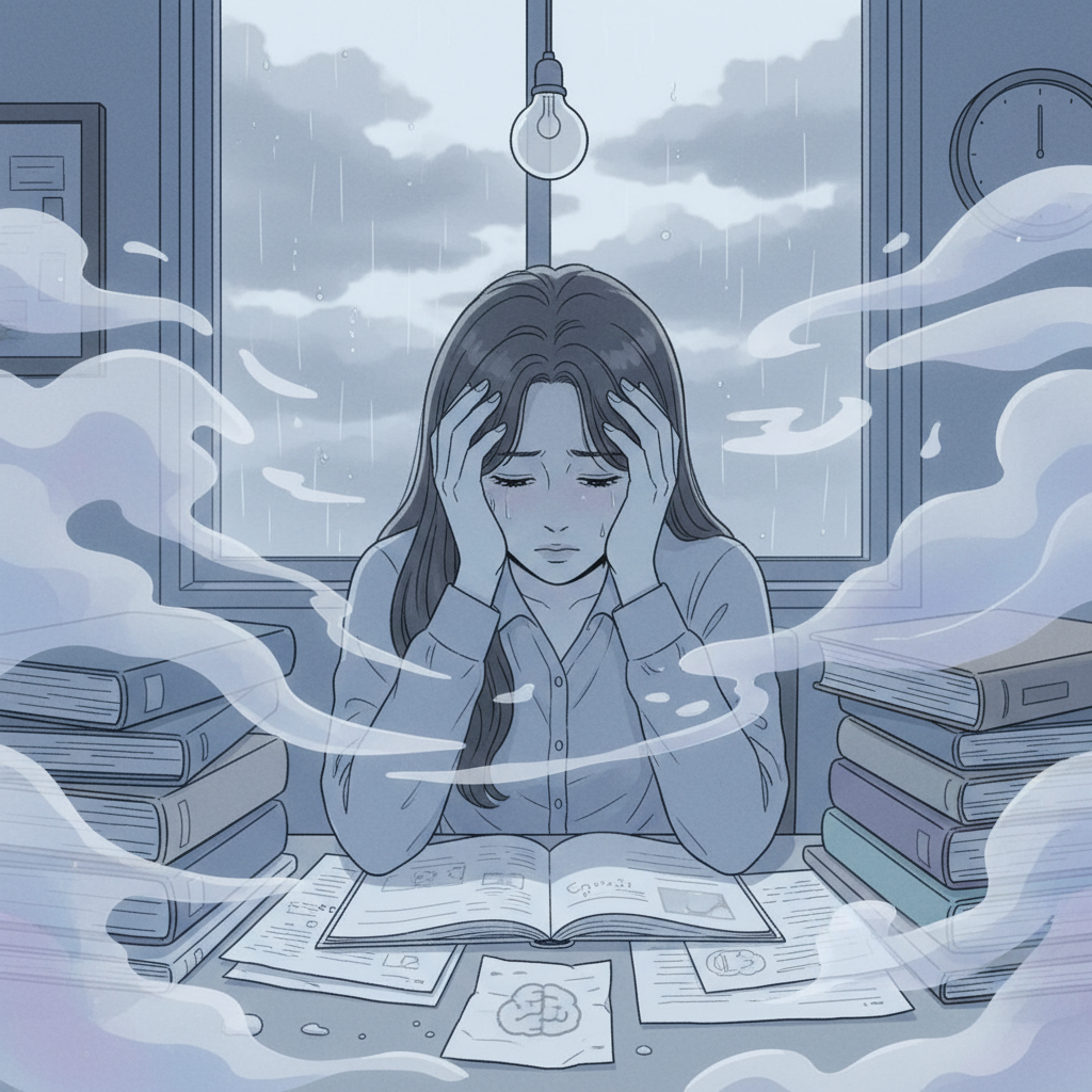 우울증은 공부하려는 의지를 떨어뜨리고(동기적 저하), 기분을 우울하게 하며(정서적 저하), 심지어 공부한 내용을 기억하거나 인출하는 과정까지 방해할 수 있습니다. 마치 안개 낀 것처럼 머리가 복잡하고 멍한 느낌, 그리고 기억력이 떨어지는 경험도 우울증으로 인한 인지 기능 문제일 수 있습니다. 이러한 이유로 노력해도 성적이 오르지 않으면 '학습된 무력감'에 빠져 우울증이 더욱 심화되기도 합니다.