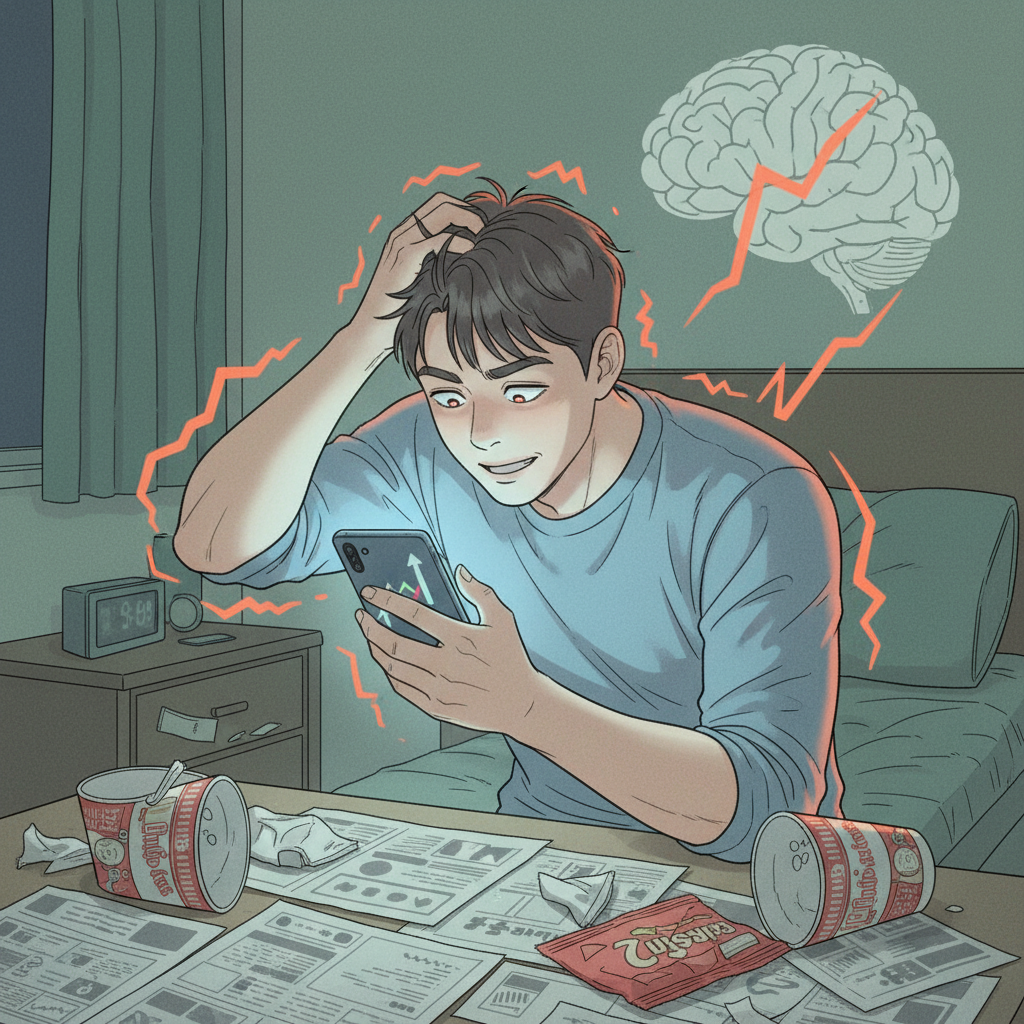 정신 건강 측면에서도 심각한 문제를 야기합니다. 주식 시세를 끊임없이 확인하며 일상에 집중하지 못하고, 불안감, 초조함, 우울감, 스트레스에 시달립니다. 투자를 중단하려 할 때 불안이나 우울, 무기력 등의 금단 증상이 나타나기도 합니다. 이러한 상태가 지속되면 공황장애, 불안장애, 불면증, 우울증 등 심각한 정신 질환으로 이어질 수 있으며, 뇌의 전두엽과 중피질 경로가 손상되어 욕구 조절 및 의사 결정 능력에 문제가 생길 위험도 있습니다.